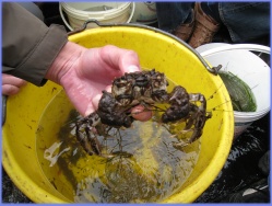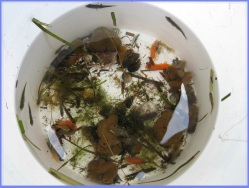 Unter jeder Menge Seegras finden wir so manche Schätze, die die Ostsee verbirgt. Unsere gefangenen Tiere und Pflanzen kommen in den Fangeimer, den die Gruppe „Seegras und Blasentang” später näher untersucht.