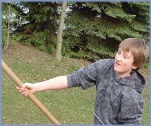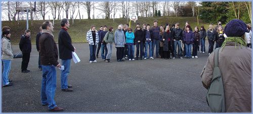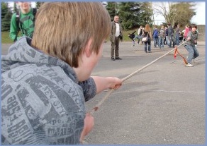 Auf dem Schulhof wetteiferten die einzelnen Klassen bei den von den Elfern organisierten schottischen Highlandgames: Baumstammwerfen, Tauziehen oder Gummistiefelweitwurf waren angesagt und brachten manchen Zuschauer zum Schmunzeln. Später wurden den Besten von Anne und Christian die Siegerurkunden überreicht. |