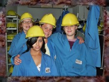 | Wir stärkten uns erst einmal mit Pausenbroten. Anschließend bekamen wir jeder einen Schutzkittel und einen Helm, die natürlich niemanden richtig passten. Das war vielleicht ein Spaß. |