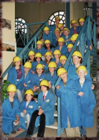 | Wir stärkten uns erst einmal mit Pausenbroten. Anschließend bekamen wir jeder einen Schutzkittel und einen Helm, die natürlich niemanden richtig passten. Das war vielleicht ein Spaß. |